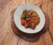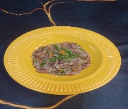 Arroz ao pato - Cenoura em brunoise; Cebola roxa em brunoise; Cebola comum em brunoise; Dente de alho em peetit brunoise; Arroz agulhinha e / ou cateto; Carne de pato desfiada (podendo ser substituida por galinha ou linguiça); Vinho tinto; Sal e pimenta do reino; Azeite de oliva; Vagem picada; Caldo de legumes. | |