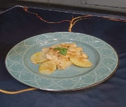 Bacalhau às natas - 500 g de lombo de bacalhau dessalgado; Batatas em rondele; Cebolas em Juliene; Sal e pimenta do reino; Azeite de oliva; Nata; Noz moscada; Manteiga; Dentes de alho em brunoise; Leite. | |