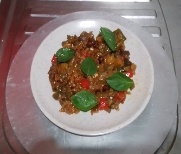 CAPONATA - kind of dish to eat hot. It have Onion; eggplant; green bell pepper; red bell pepper; yellow bell pepper; basil; sweet paprika; smoked paprika; garlic, etc... Salada, tipo para se comer quente! cebola; berinjela; pimentão verde; pimentão vermelho; pimentão amarelo; manjericão; paprica doce; paprica defumada; alho etc. - 2 unid. beringela sem casca em brunoise; 1 pimentão verde me brunoise; 1 pimentão vermelho em brunoise; 1 pimentão amarelo em brunoise; 2 unid cebola em brunoise; 2 unidades dente de alho em brunoise; 60gr alcaparras; 60gr azeitonas verdes; q.b. ml azeite de oliva; q.b. pimenta do reino; 2 unid folhas de louro; 60ml vinagre de vinho tinto; q.b. Gr menjericão; 10gr páprica doce; 10gr páprica defumada; 5gr cominho e 20gr oregano seco. |