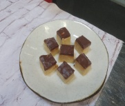 Fudge de caramelo salgado - 250g de açúcar cristal; 90g de açúcar mascavo; 40g de mel; 60ml de água; 240g Creme de leite fresco e/ou nata; 6g sal grosso picado na faca; 500g de chocolate branco em gotas; Ganache de chocolate preto; 100g de chocolate preto; 100g de chocolate meio amargo; 240g de creme de leite fresco e/ou nata; | |