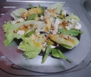 Salad caramelized pear - pêra caramelizada; queijo gorgonzola; nozes vinagrete picante licor curaçau - Ingredientes: 50gr Alface Americana; 50gr Alface Roxa; 50gr Rúcula; 40gr Queijo gorgonzola; 50gr Nozes tostadas e 20ml Molho de vinagrete picante de licor de curaçau. Pêra caramelizada: 1 Unid. Pêra; 100 gr açúcar; 20 Ml Vinho branco. Molho de vinagrete picante de licor de curaçau: 100 ml Licor de curaçau; q.b. ml Azeite extravirgem; 20 ml Vinagre de maçã ou de vinho branco; q.b. gr Pimenta branca moída; 20 gr Pimenta Cambuci; 20 gr pimenta biquinho e q.b. fr sal. |