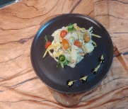 KARTOFFELSALAT - 1/2 pepino; molho (2 gemas inteiras; óleo de soja e vinagre - pode ser imcrementado por mostarda); tomates pequenos; cebolinha; cebolas roxas e salsinha à gosto. | |