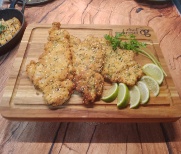 Schweineschnitzel - 1 kg de lombo suíno; 100g de farinha de trigo; 3 unid de ovos; 200g de farinha de rosca; 1 maço de salsicha; 50g de gergelim; 50g de molho de alho/pasta de alho; 40g de mostarda escura; algumas gramas de cominho. | |