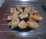 Torrada; maionese caseira (incluindo abacate mesmo sendo salgada) e camarão. A maionese ficou tão boa que serve em hamburger gourmet. - Abacate; pão francês (ou baguete para ser cortada em fatias); leite; óleo de soja(para engrossar o leite - pode ser usado azeite de oliva); camarões (sem cabeça e sem calda); sal; pimenta do reino e azeite de oliva (mais para fritar os camarões). | |